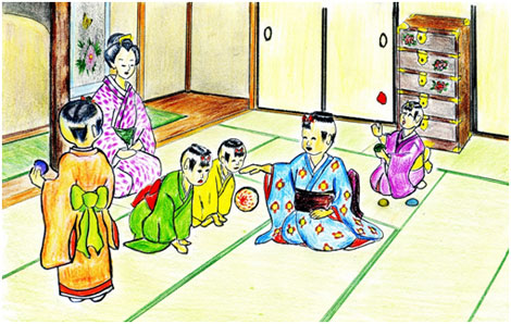 そして、手遊びの品々を全て自分の部屋に並べて、遊び相手の子ども達に分かち与え、敗れ損ねた手遊びの品は、「川へ流せ」と侍女たちに仰せられたのでありました。